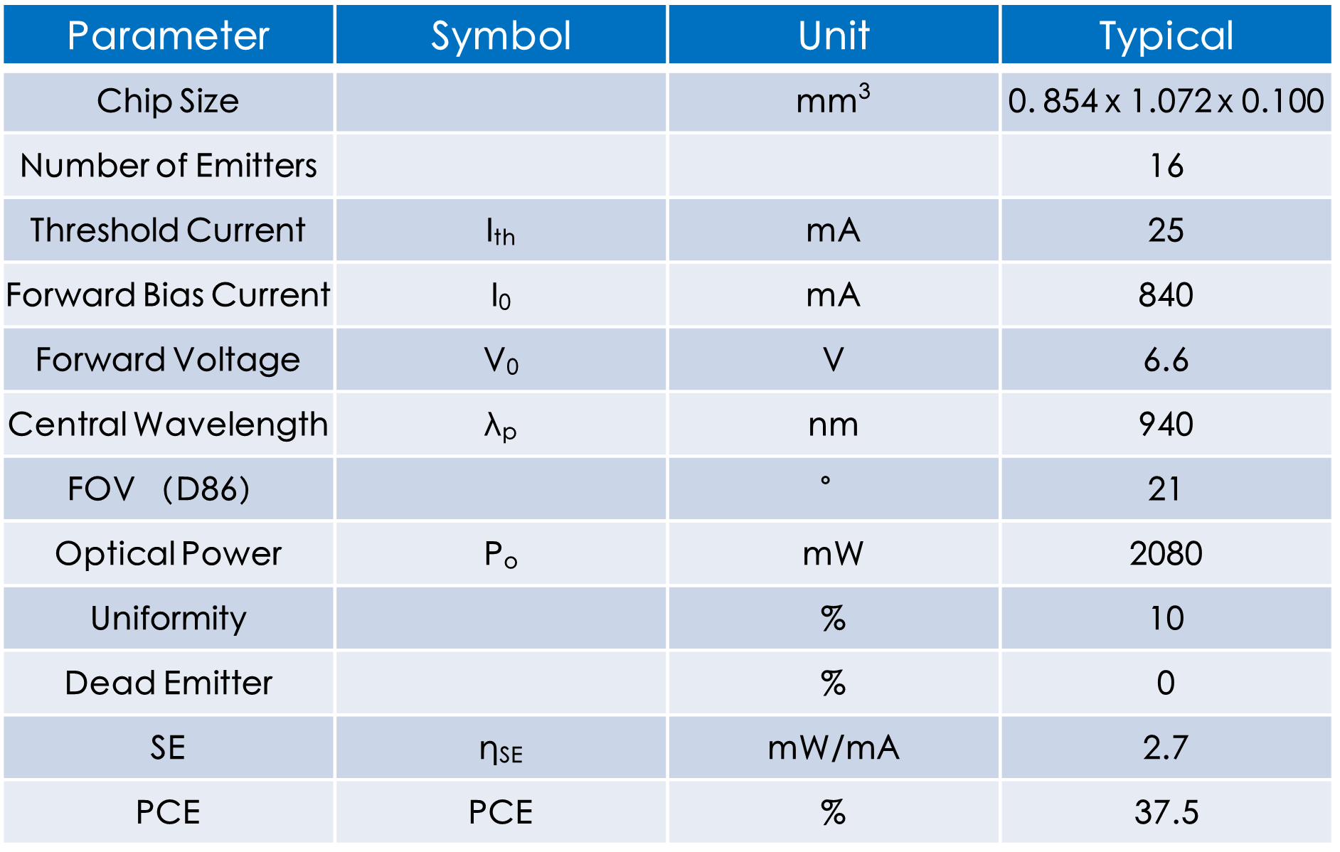 規(guī)則陣列940nm VCSEL 功率:2.08 PCE:37.5%