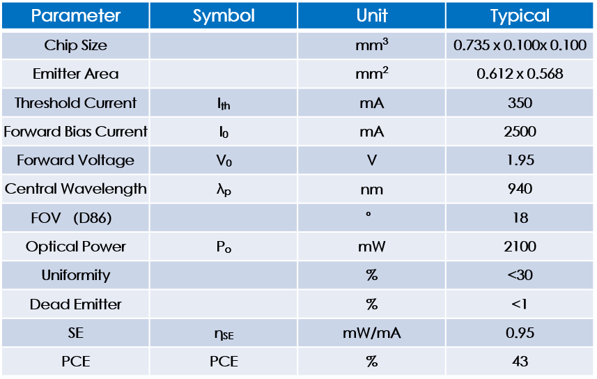 非規(guī)則陣列940nm VCSEL 功率:1.75W PCE:42% 可定制pattern開(kāi)發(fā)